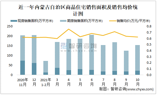 根據國家統計局數據可知:2021年10月內蒙古自治區商品住宅銷售面積為154.2萬平方米(其中銷售現房22.31萬平方米,期房131.89萬平方米),銷售額為96.5億元,銷售均價約為0.63萬元/平方米;2021年1-10月內蒙古自治區商品住宅累計銷售面積為1421.42萬平方米,銷售面積累計同比下降2.5%,累計銷售額為942.29億元,銷售額累計同比下降4.8%;近一年內蒙古自治區商品住宅銷售均價2021年4月達到最高值,此后有所下滑,期房銷售面積遠高于現房銷售面積。