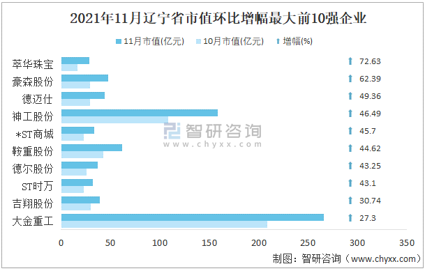 2021年11月遼寧省A股上市企業(yè)市值環(huán)比增幅最大前10強企業(yè)