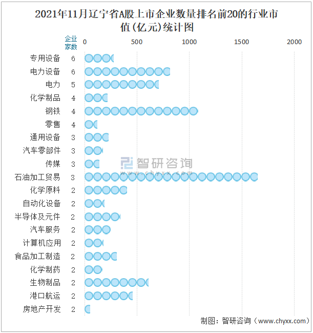 2021年11月遼寧省A股上市企業(yè)數(shù)量排名前20的行業(yè)市值(億元)統(tǒng)計圖