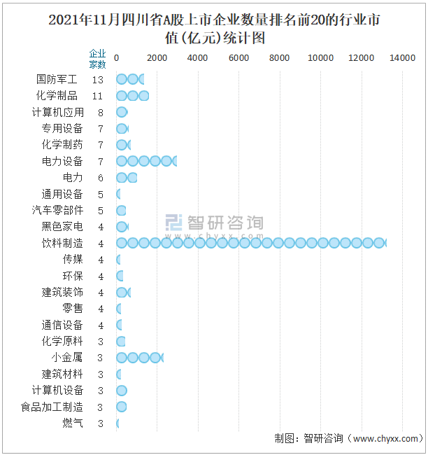 2021年11月四川省A股上市企業數量排名前20的行業市值(億元)統計圖