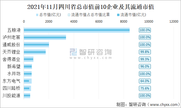2021年11月四川省A股上市總市值前10強企業及其流通市值