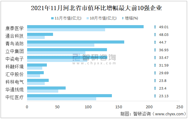 2021年11月河北省A股上市企業市值環比增幅最大前10強企業