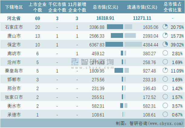 據同花順統計數據可知:11月河北省新增3家企業在A股上市,截止至2021年11月30日,河北省的A股上市企業共計69家,上市企業數量排名全國第14,總市值共計16318.91億元;河北省下轄的11個地級行政區均有企業在A股上市,其中石家莊市上市企業數量最多,為20家;河北省的A股上市千億市值企業數量在全國排名第12,共計3家,分布在唐山市、保定市、秦皇島市3個地區,其中唐山市千億市值企業最多,為1家;保定市A股上市企業總市值總流通市值均為最高。