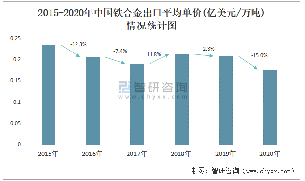 根據中國海關數據顯示:2015-2020年中國鐵合金出口數量與出口金額均在2018年達到最高值,此后逐年遞減;2015-2020年中國鐵合金出口平均單價2018年增長速度最快,而2020年中國鐵合金出口平均單價下降速度最快,下滑了15.0%,跌至最低值。