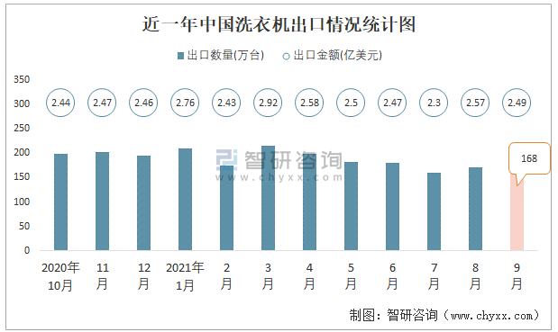根據中國海關數據顯示:2021年9月中國洗衣機出口數量為168萬臺,同比下降26%,出口金額為2.49億美元,同比下降10.5%;2021年1-9月中國洗衣機出口數量為1658萬臺,出口金額為23.02億美元。