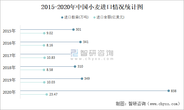 2015-2020年中國小麥進口情況統計圖