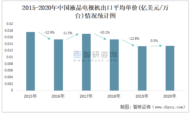 2015-2020年中國(guó)液晶電視機(jī)出口平均單價(jià)(億美元/萬(wàn)臺(tái))情況統(tǒng)計(jì)圖