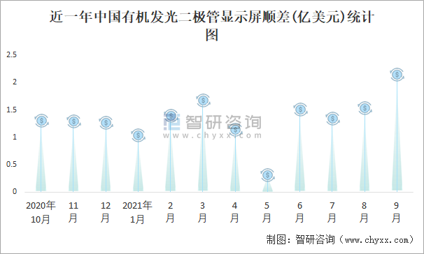 近一年中國有機發光二極管顯示屏順差(億美元)統計圖