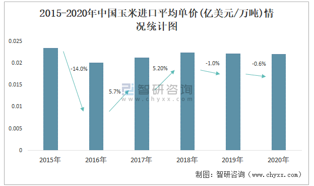 2015-2020年中國玉米進口平均單價(億美元/萬噸)情況統(tǒng)計圖