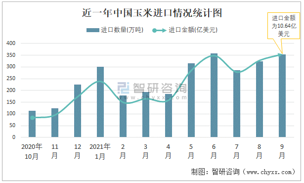 2021年9月中國玉米進口數(shù)量和進口金額分別為353萬噸和10.64億美元