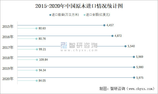2015-2020年中國原木進口情況統(tǒng)計圖