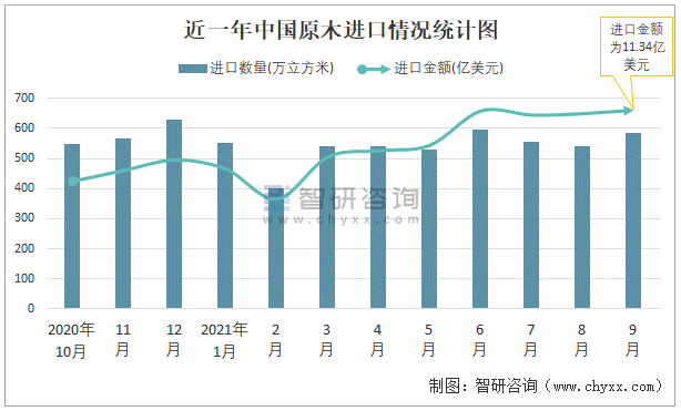 根據(jù)中國海關數(shù)據(jù)顯示:2021年9月中國原木進口數(shù)量為584萬立方米,同比下降8%,進口金額為11.34億美元,同比增長31.8%,2021年1-9月中國原木進口數(shù)量為4840萬立方米,進口金額為86.17億美元。