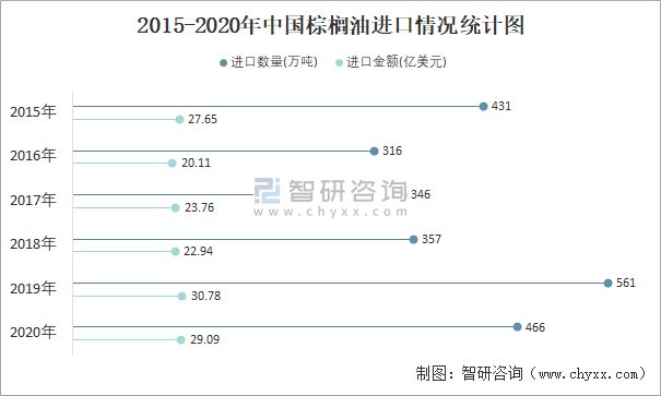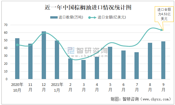 根據中國海關數據顯示:2021年9月中國棕櫚油進口數量為49萬噸,同比增長12.5%,進口金額為4.51億美元,同比增長71.5%,2021年1-9月中國棕櫚油進口數量為341萬噸,進口金額為28.71億美元。