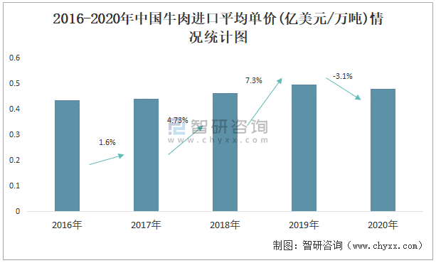 2016-2020年中國(guó)牛肉進(jìn)口平均單價(jià)(億美元/萬(wàn)噸)情況統(tǒng)計(jì)圖