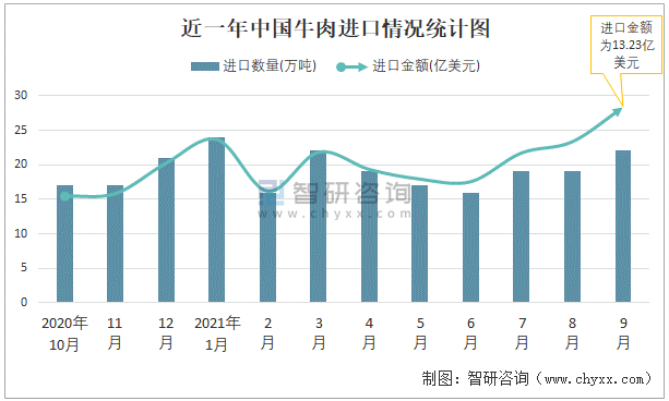 根據(jù)中國(guó)海關(guān)數(shù)據(jù)顯示:2021年9月中國(guó)牛肉進(jìn)口數(shù)量為22萬(wàn)噸,同比增長(zhǎng)22.3%,進(jìn)口金額為13.23億美元,同比增長(zhǎng)70.2%,2021年1-9月中國(guó)牛肉進(jìn)口數(shù)量為174萬(wàn)噸,進(jìn)口金額為88.61億美元。