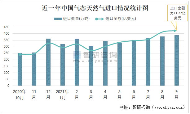 2021年9月中國氣態天然氣進口數量和進口金額分別為387萬噸和11.27億美元