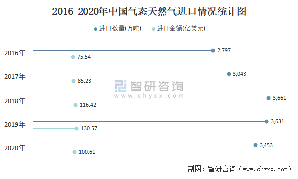 根據中國海關數據顯示:2016-2020年中國氣態天然氣進口數量2018年達到最大值,此后逐年遞減,進口金額2019年達到最高值,此后有所下降;2016-2020年中國氣態天然氣進口平均單價2018年增速最快,而2020年進口平均單價下滑速度最快,下滑了19.0%。
