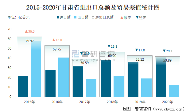 2015-2020年甘肅省進出口總額及貿易差值統(tǒng)計圖