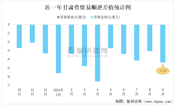 近一年甘肅省貿易順逆差值統(tǒng)計圖