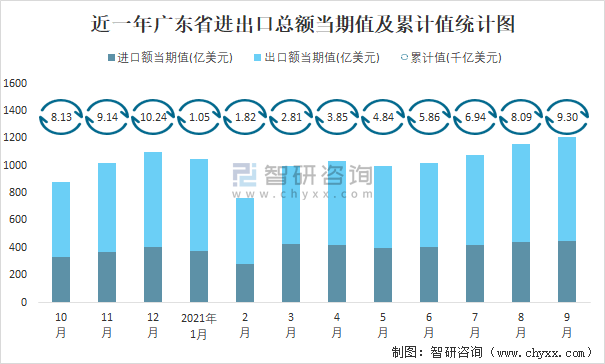 2021年1-9月廣東省進出口總額為9.3千億美元,累計同比增長28.4%