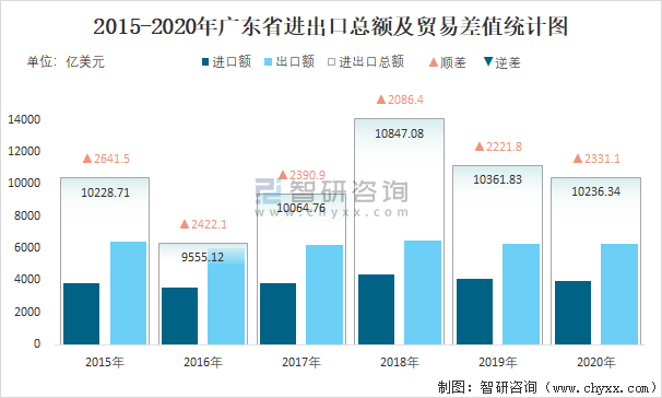 2015-2020年廣東省進出口總額及貿易差值統計圖