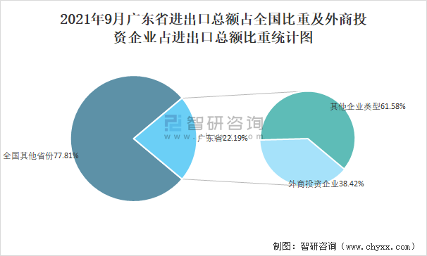 2021年9月廣東省進出口總額占全國比重及外商投資企業占進出口總額比重統計圖