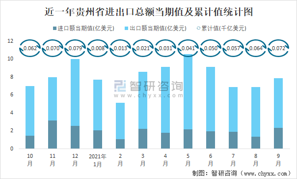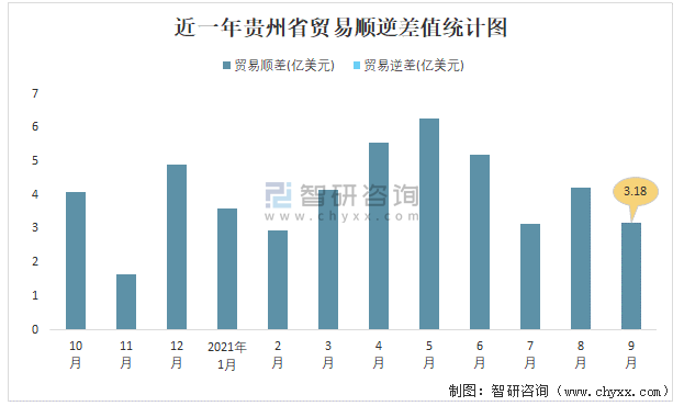 近一年貴州省進出口每月均呈現貿易順差狀態,其差值在2021年5月達到最大值,此后總體呈現下降趨勢,2021年9月貴州省進出口貿易差值為3.18億美元。2021年9月貴州省進出口總額占全國比重為0.14%,相較于其他類型的企業,其中貴州省外商投資企業進出口總額占進出口總額比重為6.91%。