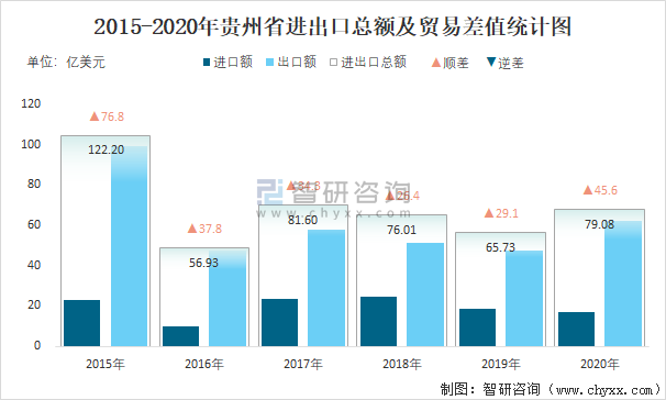 2015-2020年貴州省進出口總額及貿易差值統計圖