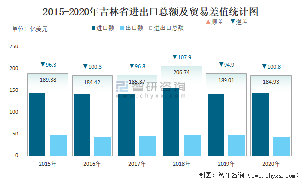 2015-2020年吉林省進出口總額及貿易差值統計圖
