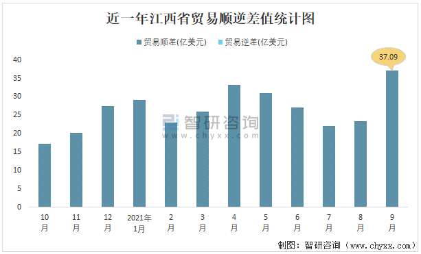 近一年江西省進出口每月均呈現貿易順差狀態,其差值在2021年9月達到最大值,2021年9月江西省進出口貿易差值為37.09億美元。2021年9月江西省進出口總額占全國比重為1.33%,相較于其他類型的企業,其中江西省外商投資企業進出口總額占進出口總額比重為20.55%。