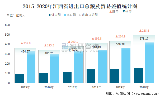 2015-2020年江西省進出口總額及貿易差值統計圖