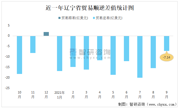 近一年遼寧省貿(mào)易順逆差值統(tǒng)計圖