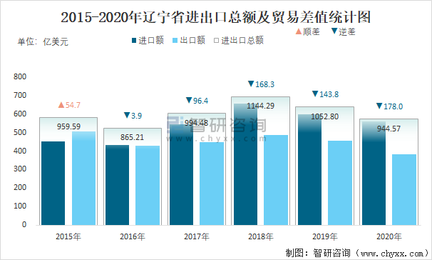 2015-2020年遼寧省進出口總額及貿(mào)易差值統(tǒng)計圖