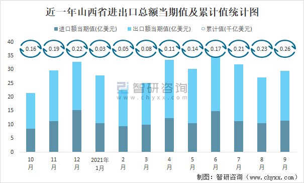 近一年山西省進出口總額當期值及累計值統計圖