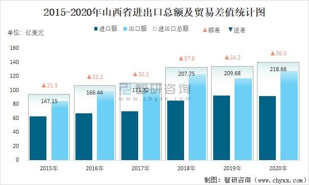 2015-2020年山西省進出口總額及貿易差值統計圖