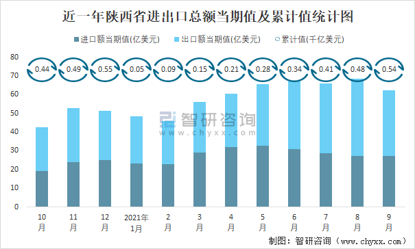 2021年9月陜西省進出口總額為62.43億美元,其中進口額為27.26億美元,出口額為35.17億美元;2021年1-9月進出口總額為0.54千億美元,進出口總額(以美元計價)累計同比增長35.7%,其中累計進口額占比46.97%,累計出口額占比53.03%。2015-2020年陜西省進出口總額在2016年跌至最低值,此后總體呈現上升趨勢;2015-2020年陜西省進出口貿易差值2016年起呈現貿易順差狀態。