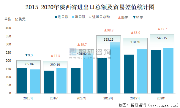2015-2020年陜西省進出口總額及貿易差值統計圖