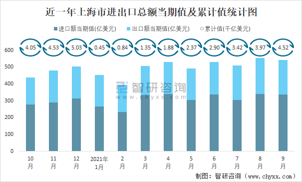 近一年上海市進出口總額當(dāng)期值及累計值統(tǒng)計圖
