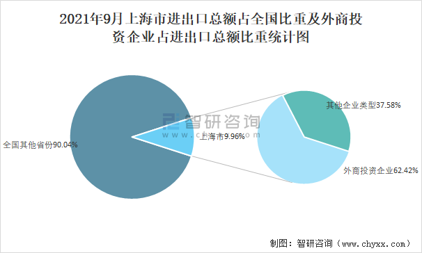 2021年9月上海市進出口總額占全國比重及外商投資企業(yè)占進出口總額比重統(tǒng)計圖