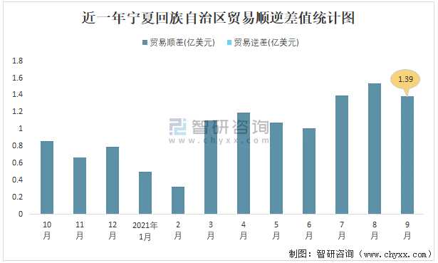 近一年寧夏回族自治區(qū)貿(mào)易順逆差值統(tǒng)計圖