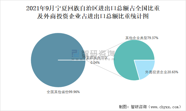 2021年9月寧夏回族自治區(qū)進出口總額占全國比重及外商投資企業(yè)占進出口總額比重統(tǒng)計圖