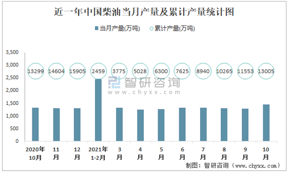 近一年中國柴油當月產量及累計產量統計圖