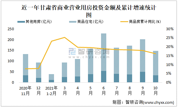 根據(jù)國家統(tǒng)計局?jǐn)?shù)據(jù)統(tǒng)計可知:2021年9月甘肅省房地產(chǎn)開發(fā)投資商品房投資金額為147.83億元,其中包括辦公樓、商業(yè)營業(yè)用房等其他用房34.12億元(注:辦公樓、商業(yè)營業(yè)用房未分開統(tǒng)計);2021年1-10月甘肅省房地產(chǎn)開發(fā)投資包括商業(yè)營業(yè)用房在內(nèi)的其他用房累計金額為321.18億元。