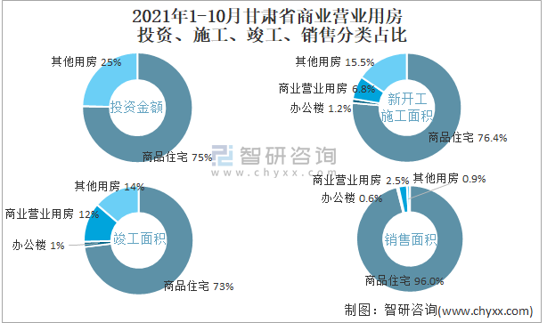 2021年1-10月甘肅省商業(yè)營業(yè)用房投資、施工、竣工、銷售分類占比