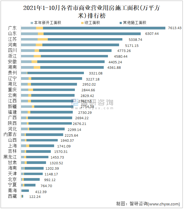 2021年1-10月各省市商業(yè)營業(yè)用房施工面積(萬平方米)排行榜