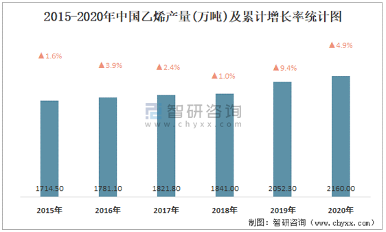 2015-2020年中國(guó)乙烯產(chǎn)量及累計(jì)增長(zhǎng)率統(tǒng)計(jì)圖