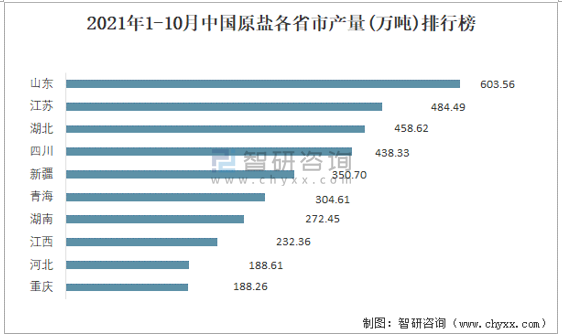 2021年1-10月中國(guó)原鹽各省市產(chǎn)量排行榜