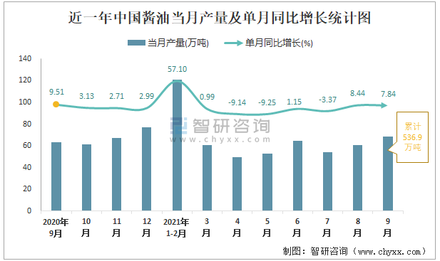 根據(jù)國家統(tǒng)計(jì)局?jǐn)?shù)據(jù)顯示:2021年9月中國醬油產(chǎn)量為68.5萬噸,同比增長7.84%;2021年1-9月中國醬油累計(jì)產(chǎn)量為536.9萬噸,同比增長8.4%;2015-2020年中國醬油產(chǎn)量2018年跌至最低,此后呈現(xiàn)遞增趨勢(shì)。