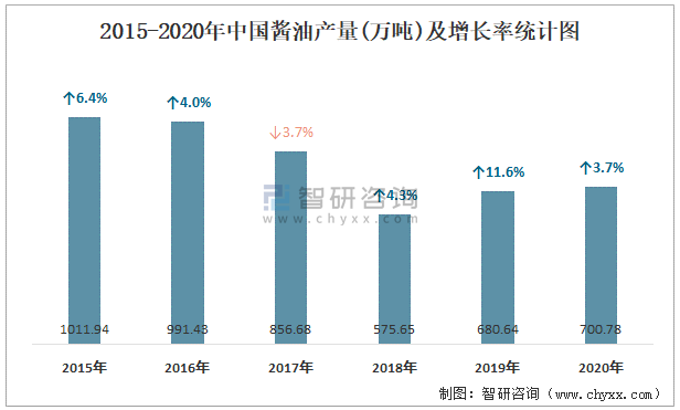 2015-2020年中國醬油產(chǎn)量及增長率統(tǒng)計(jì)圖
