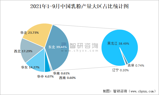 2021年1-9月中國(guó)乳粉產(chǎn)量大區(qū)占比統(tǒng)計(jì)圖